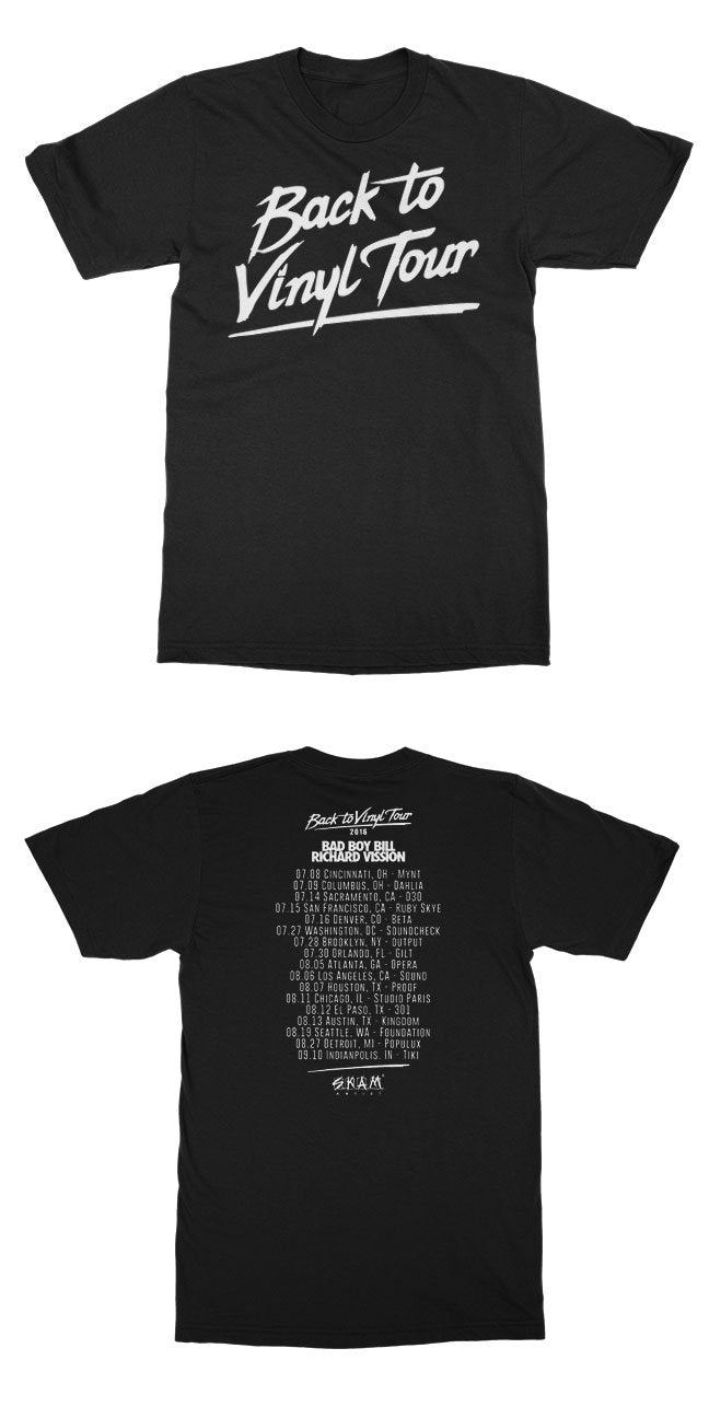 Back To Vinyl "Tour" tees are printed on premium, cotton tees and feature a front and back print.
