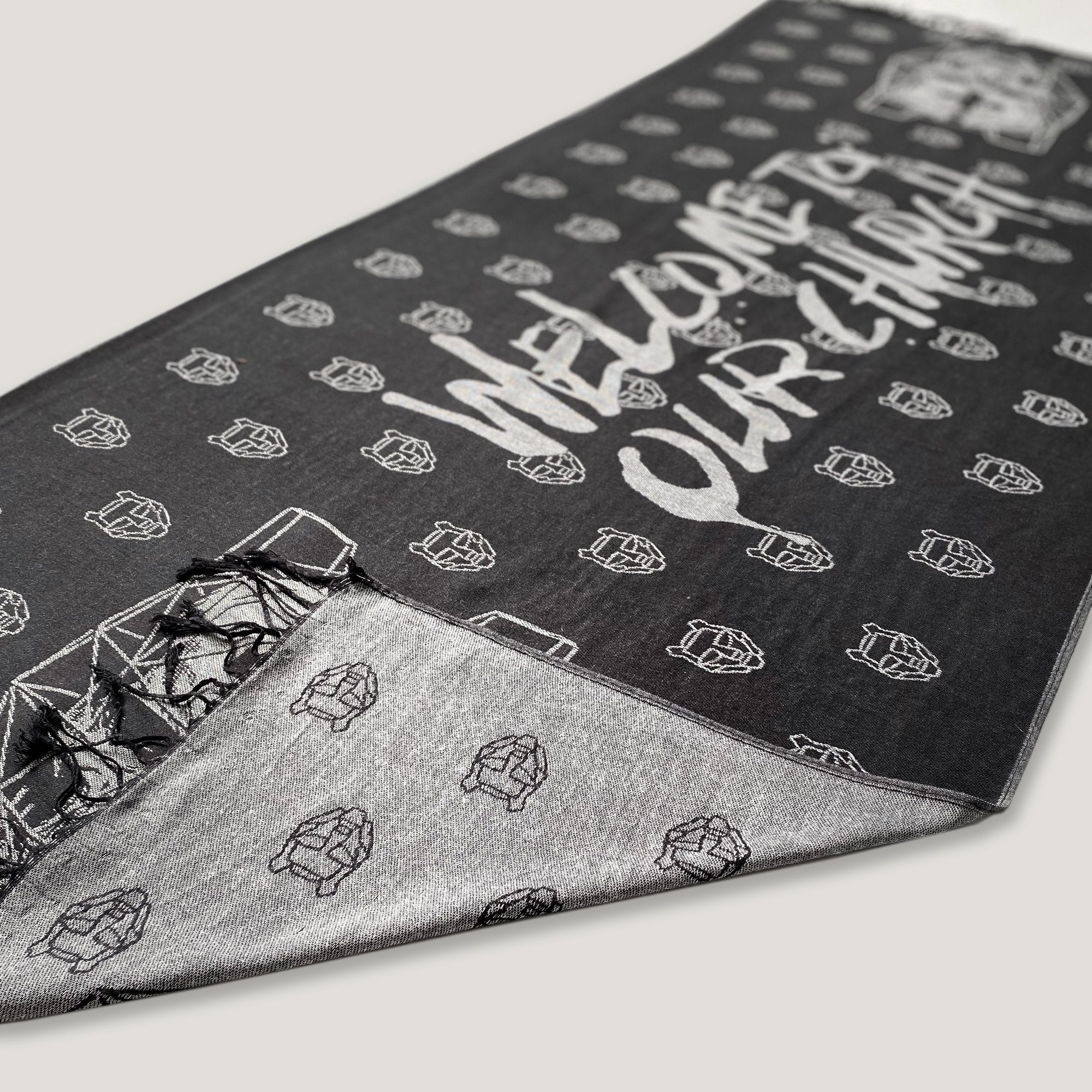 Custom knit pashmina with BTSM helmet and Welcome to Our Church designs.