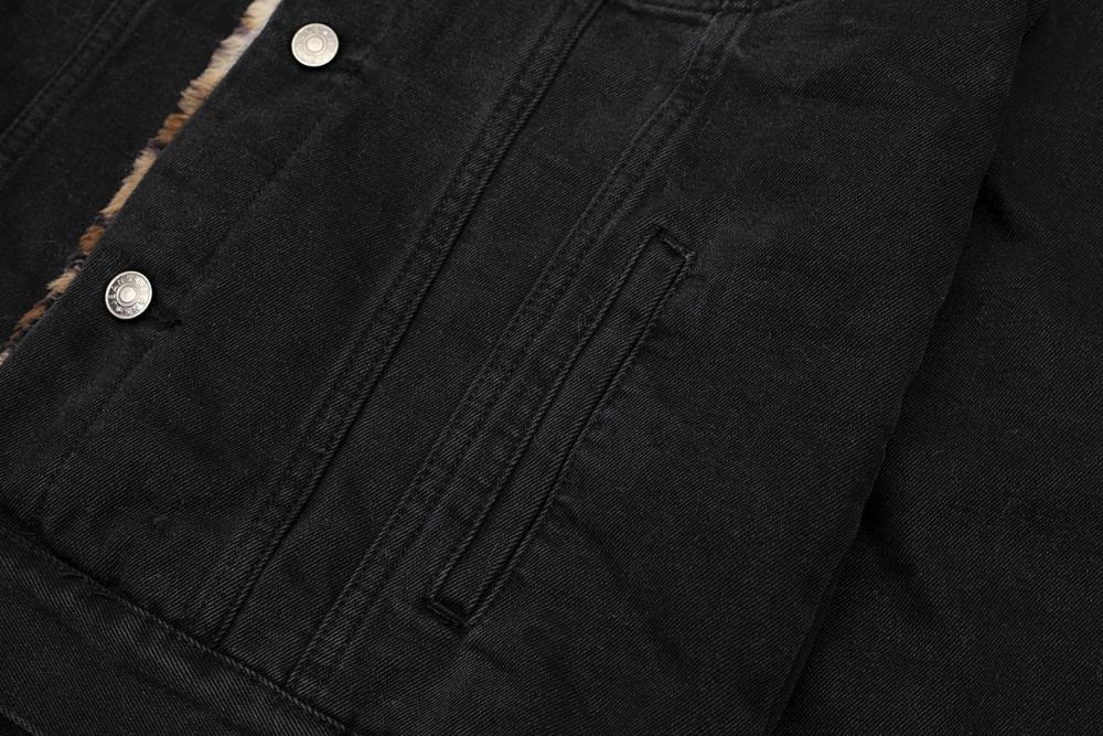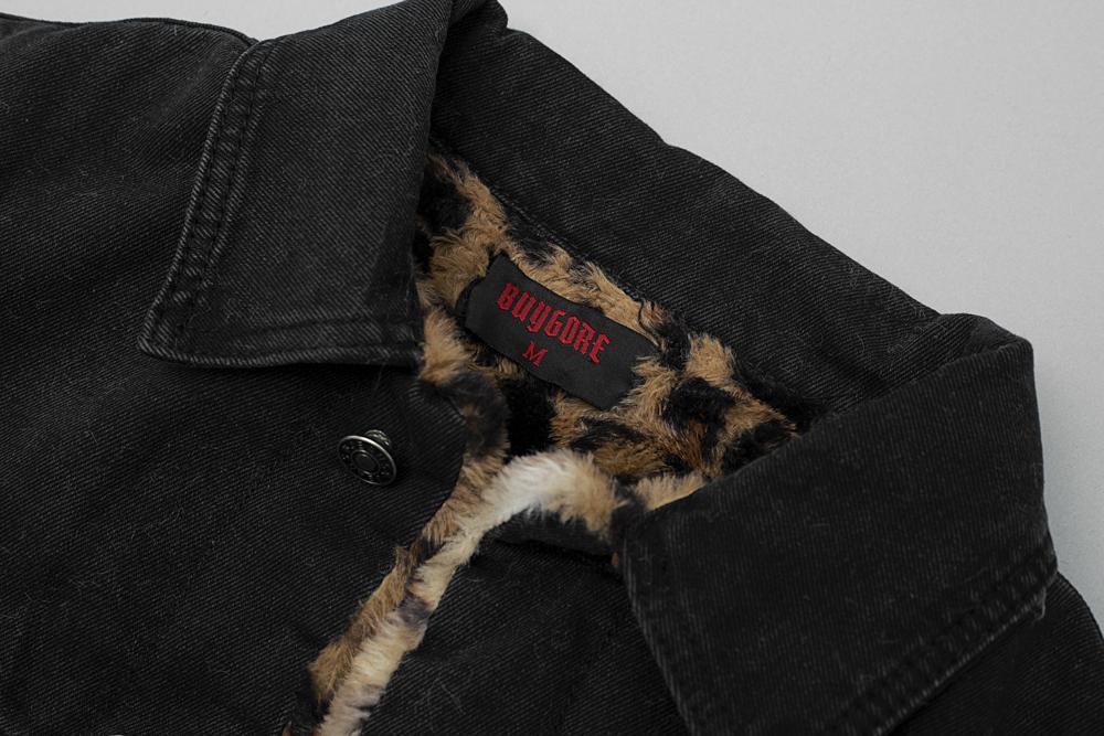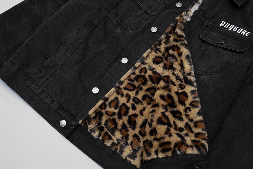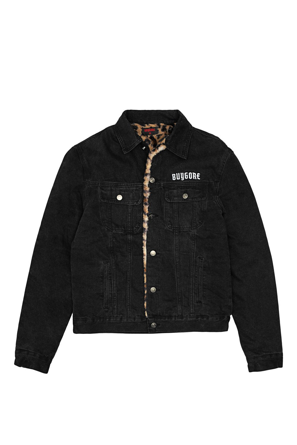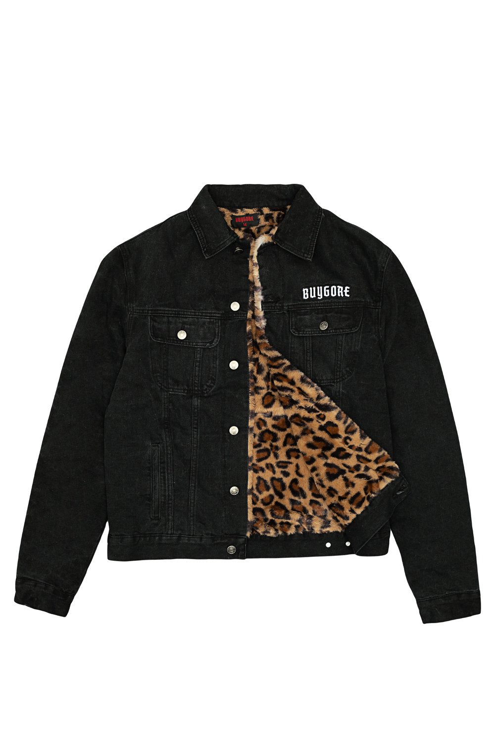 Buygore black denim jacket, leopard faux fur lining, oversized.