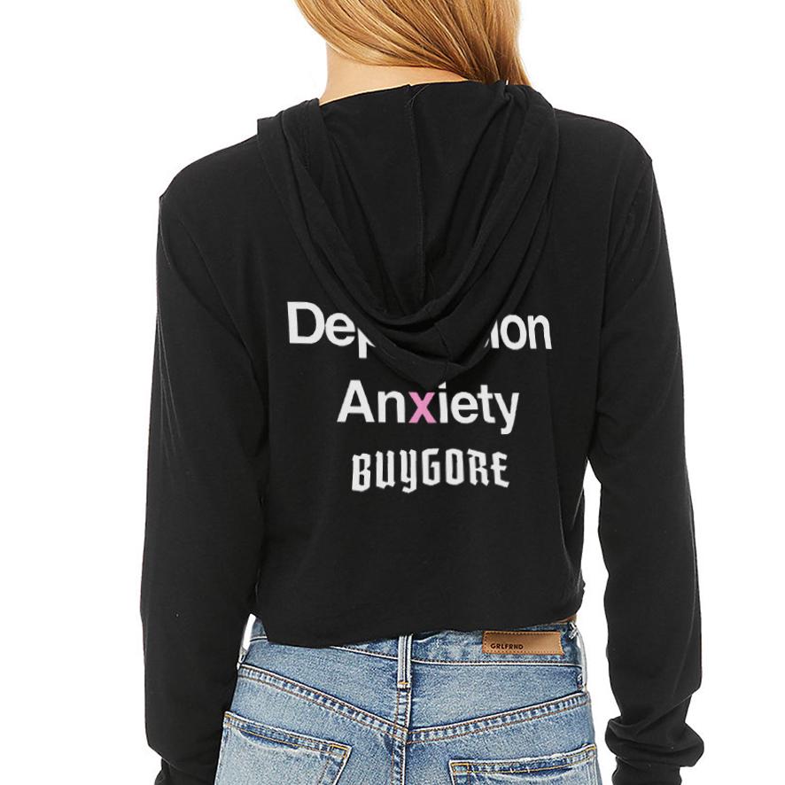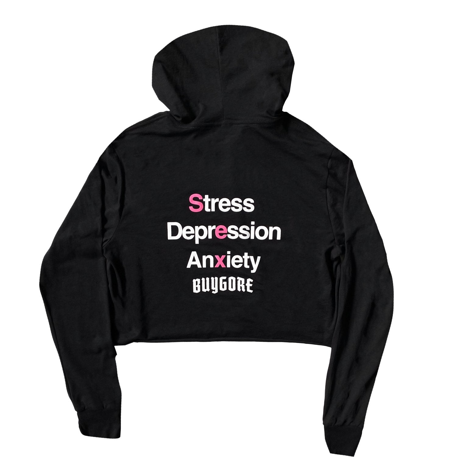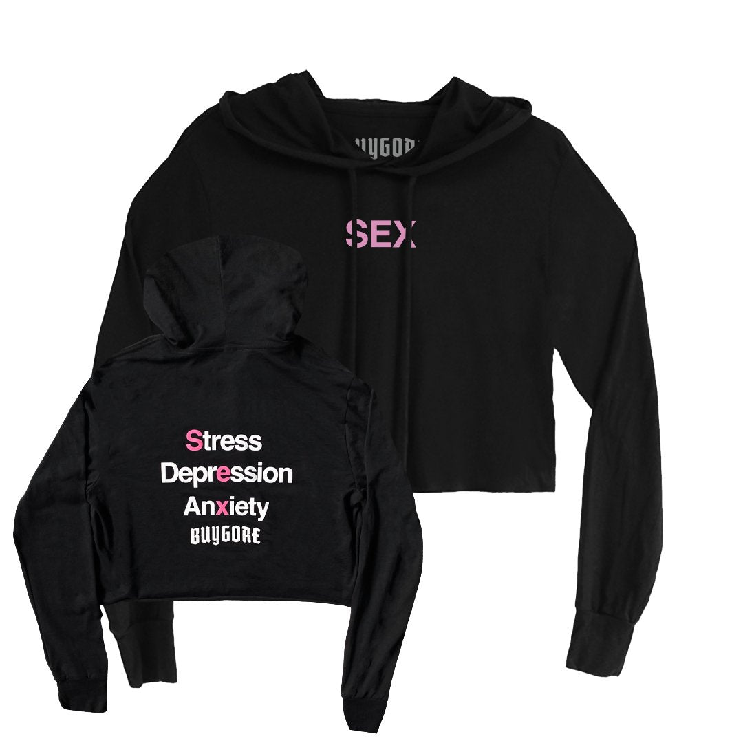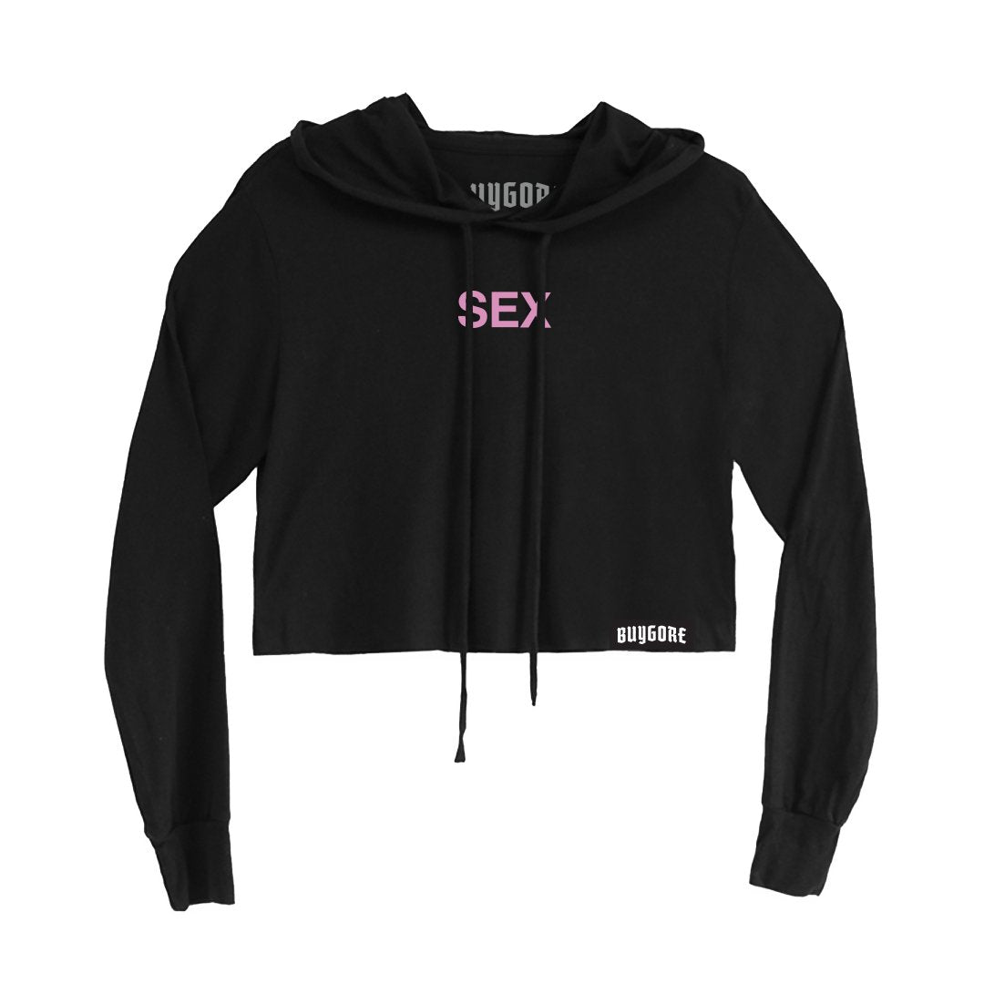 Buygore "SEX" ladies cropped hoodies. Ultra sheer, lightweight with front and back prints, and a front woven label.
