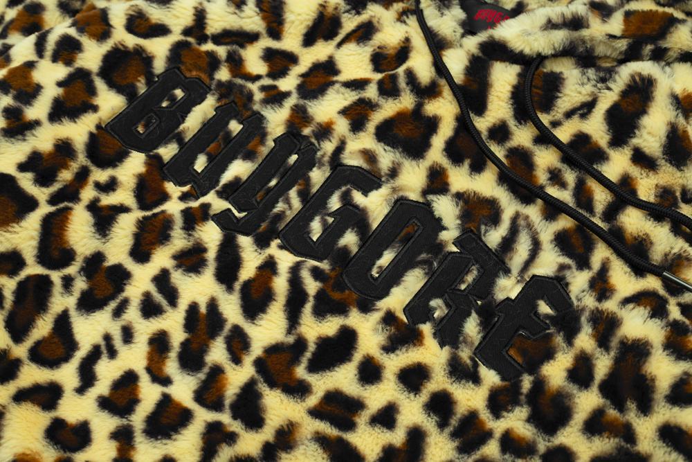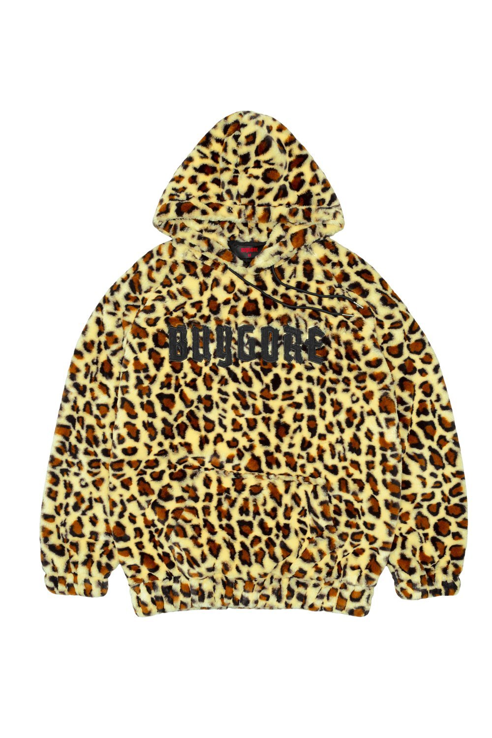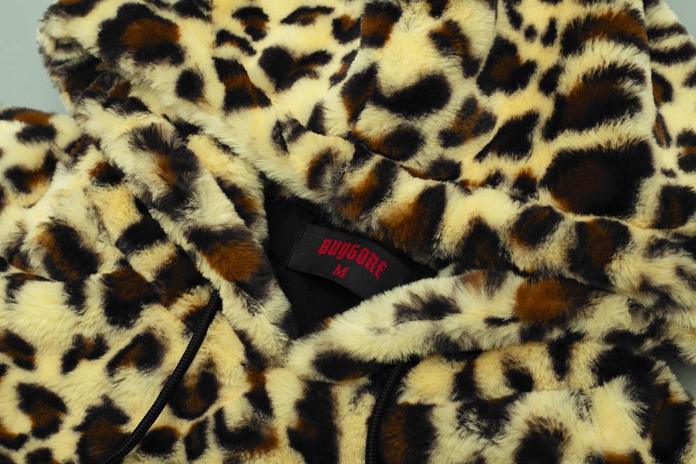 Fuzzy leopard print hoodie with BUYGORE logo, oversized.